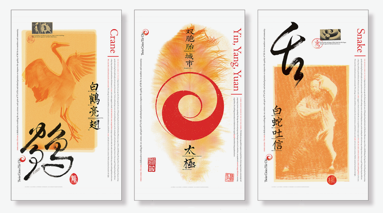 In 2017, Todd presented his design for the Year of the Rooster. It was a departure in look and feel that perfectly represented the new direction the studio had taken. In 2018, instead of continuing the familiar animal theme, I asked Todd if he would design a permanent set of posters that would represent the studio and its mission, as well as T’ai Chi and its underlying history and philosophy. He created the three posters that hang at the center of our practice hall. The following is a description of the rich symbolism contained in each poster and shows how the three posters together represent Twin Cities T’ai Chi as a community, as a school that’s part of a larger history, and as a creative source of energy and ideas that is helping to evolve the art of T’ai Chi for future generations.—Paul