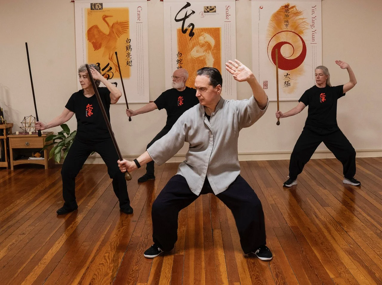 From this dream, Chang San Feng then conceived of the primary techniques of T’ai Chi based on circularity, the continuous flow of hard and soft, and other Taoist health and longevity practices. As a symbol, the snake represents yin energy: soft, circular, flexible, dark, close to the earth, with the ability to transform itself by shedding its skin. The crane represents yang energy—expanding, soaring, light, close to the heavens—and is a symbol of longevity. A balanced and continuous interplay of these attributes is the essence of T’ai Chi.